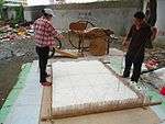 Throughout China, a simple method of producing quilts is employed. It involves setting up a temporary site. At the site, a frame is assembled within which a lattice work of cotton thread is made. Cotton batting, either new or retrieved from discarded quilts, is prepared in a mobile carding machine. The mechanism of the carding machine is powered by a small, petrol motor. The batting is then added, layer by layer, to the area within the frame. Between each layer, a new lattice of thread is created with a wooden disk used to tamp down the layer. (See: Image series showing production method)