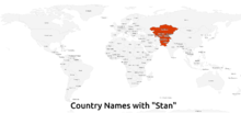 The suffix -stan (Persian: ـستان -stān) is Persian for "place of"[1] or "country".[2] It appears in the names of many regions, especially in Central and South Asia, but also in the Caucasus and Russia; areas where significant amounts of Persian culture were spread or adopted. The suffix is also used more generally, as in Persian, and Urdu rigestân (ریگستان) "place of sand, desert", Pakistan "land of the pure", Hindustan "land of the Indus river", golestan (گلستان) "place of flowers, garden", and in Bengali koborstan (কবরস্থান) "graveyard/cemetery" etc.