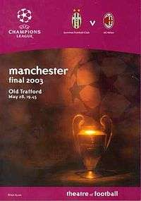 The 2003 UEFA Champions League Final was a football match that took place at Old Trafford in Manchester, England on 28 May 2003 to decide the winner of the 2002–03 UEFA Champions League. The match was contested by two Italian teams: Juventus and Milan. The match made history as it was the first time two clubs from Italy had faced each other in the final. It was also the second intra-national final of the competition, following the all-Spanish 2000 UEFA Champions League Final three years earlier. Milan won the match via a penalty shoot-out after the game had finished 0–0 after extra time. It gave Milan their sixth success in the European Cup.