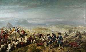 The regiment embarked for Holland in June 1701 and took part in the sieges of Kaiserswerth and of Venlo in spring 1702 during the War of the Spanish Succession.[10] In March 1704 the regiment embarked for Lisbon and took part in the Battle of Almansa in April 1707[11] before returning to England in summer 1708.[12] The regiment was then based in Minorca from summer 1718 to 1746.[13] The regiment was renamed the 9th Regiment of Foot in 1751 when all British regiments were given numbers for identification instead of using their Colonel's name.[2] During the Seven Years' War the Regiment won its first formal battle honour as part of the expedition that captured Belle Île from the French in 1761.[14] It sailed for Cuba with George Keppel, 3rd Earl of Albemarle in March 1762 and took part in the siege and subsequent capture of Havana in summer 1762.[15]