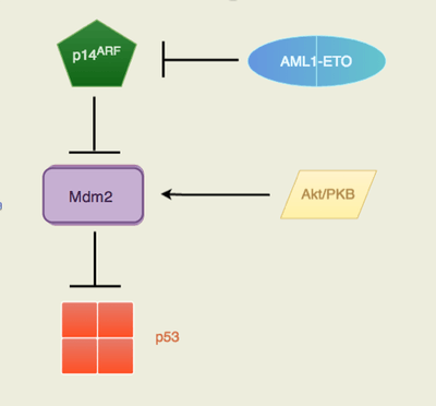 The fusion oncoprotein involves the gene AML1 (now known as RUNX1) and ETO (now known as RUNX1T1). AML1, located at the 21q22, normally has the ability to activate transcription of the ARF gene and ETO, located at the 8q22, normally has the ability to repress transcription. The fusion protein AML1-ETO is commonly found in acute myeloid leukemia patients. p14ARF is a well known tumor suppressor that serves as the safety net when p53 tumor suppressor’s functions are inhibited. Many cancers recognize the potential of the p14ARF tumor suppressor to block cell growth so it is commonly mutated or inhibited in cancer cells. The AML1-ETO is incapable of p14ARF transcription as the fusion protein took on AML1’s involvement with ARF gene expression and ETO’s transcription repression. The Akt/PKB signaling is a pathway that is pro-survival and growth. By activating Mdm2, the signal transduction pathway will trigger the anti-apoptotic downstream effects of Mdm2. With no p14ARF to regulate and inhibit Mdm2, there will be an increased level of suppression of p53. Mdm2 is a proto-oncogene that directly antagonizes p53 to ubiquitination (Figure 1). The p53 protein is known as the “guardian of the genome” due to its ability to induce DNA repair enzymes and regulate cell cycle advancements. The down regulation of p53 by Mdm2 would lead to unchecked proliferative growth. The direct consequence of having the fusion protein, AML1-ETO, is the lack of p53 regulation in pre-leukemic cells. Therefore, there are an increased number of immature cells that are unable to carry out normal function, which is essentially cancer (Faderi et al., 2000, Song et al. 2005, Weinberg, 2014).