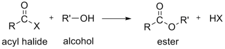 In the above reactions, HX (hydrogen halide or hydrohalic acid) is also formed. For example, if the acyl halide is an acyl chloride, HCl (hydrogen chloride or hydrochloric acid) is also formed.