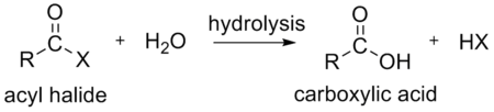 - water, to form a carboxylic acid. This hydrolysis is the most heavily exploited reaction for acyl halides as it occurs in the industrial synthesis of acetic acid.