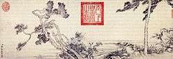 - ↑ The calligraphy was traditionally attributed to Emperor Huizong of Song, but recent scholarship ascribes it to Emperor Huizong's great-grandson, Emperor Zhangzong of Jin, who greatly admired Huizong's calligraphy.[27] The text must originally have come from another scroll which was a different size to the Admonitions Scroll, as it had to be cut up and reassembled into columns of fewer characters to fit the scroll that it is currently mounted in.[28]