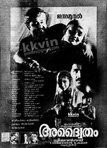 Adwaytham (Literal meaning: Non-duality) is a 1992 Indian Malayalam political crime thriller film directed by Priyadarshan and written by T. Damodaran. It stars Mohanlal, Jayaram, Revathi, Innocent, and M. G. Soman. The soundtrack for the film was composed by M. G. Radhakrishnan and the film score was done by Johnson.