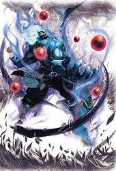 Oni (鬼 Oni, "Demon"), also known as Kuruoshiki Oni (狂オシキ鬼 Kuruoshiki Oni, "Mad Demon") is a character who makes his debut in Super Street Fighter IV: Arcade Edition as a secret boss and a playable character. Oni is in fact Akuma, who has become one with the Satsui no Hado entirely. Oni appears as a far more muscular and noticeably larger version of Akuma. He has dark blue skin, glowing yellow-red eyes and glowing, spiky shoulder-length hair, akin to the Super Saiyan of the Dragon Ball series. He also gains fangs and short protrusions on his forehead, resembling growing horns. The top half of his gi has been blown off by the amount of dark ki he emanates, showing off his musculature; the prayer beads that were once around his neck now float about disconnected around his body. He also has claws on his fingers and toes, and no longer wears sandals; his voice also sounds much more demonic. When using fierce attacks or powerful physical attacks of any kind, his arms and legs glow a superheated color. While it is difficult to spot, the kanji of "heaven" (天 ten?) also appears on his back during the same animations, seemingly having branded itself on his back. Oni's moveset is similar to Akuma's but with additional moves and modifications. Oni can perform a fireball that disappears unless charged. To replace the Shankunetsu Hadouken, Oni has an electrical variant. His standing fierce punch cancels out fireballs. Added to Oni is a dashing spinning punch which can vary depending on what kick button is pressed. While jumping, Oni can do an evasive dash backward or forward or even perform a downward attack. He also uses an overhead smash attack. Oni's gameplay consists of high-damage combos and reversal potential, combined with his above-average walk speed, that allows players to create massive-pressure situations while remaining mobile and flexible via buffering moves into other attacks, although he has below-average stamina, stun and short-range Focus Attack. Oni appears in the second half of the second DLC Lost Episode The Strongest vs. The Angriest of the video game Asura's Wrath, given the epithet of "Destroyer of Heaven". A Pandora version of Oni appears in Akuma's ending in Street Fighter X Tekken. He also appears as a playable character in strategic RPG Blood Brothers 2.