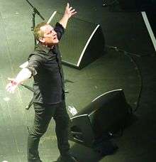 McCluskey developed a popular and distinctive onstage dance routine, dubbed by the BBC's Stuart Maconie as the "Trainee Teacher Dance".[2] Rock group ZZ Top, who shared a studio with OMD on a 1980 edition of BBC2 show The Old Grey Whistle Test, adopted the routine as part of their live set (and also played OMD's self-titled debut album over the PA prior to concerts).[3] Maconie wrote that the "jerky, leg-snapping" dance became "the dance-floor routine of choice" for teaching students in the early-to-mid 1980s.[4] Rolling Stone observed "the infectious manic energy of [OMD] frontman Andy McCluskey, a walking encyclopedia of New Wave dance moves".[5] McCluskey himself said: "I find that it becomes part of the show. It's got to a point where I am now in a shamanistic shaking ritual. I just get physically involved."[2]