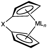 An ansa-metallocene is a type of organometallic compound containing two cyclopentadienyl ligands that are linked by a bridging group such that both cyclopentadienyl groups are bound to the same metal. The link prevents rotation of the cyclopentadienyl ligand and often modifies the structure and reactivity of the metal center. Some ansa-metallocenes are active in Ziegler-Natta catalysis, although none are used commercially.[1] The term ansa-metallocene (ansa being Greek for "handle") was coined by Lüttringhaus and Kullick to describe alkylidene-bridged ferrocenes, which were developed in the 1950s.[2]