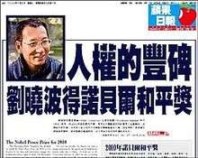 ![]() Front page on 9 October 2010 (English: "Liu Xiaobo awarded Nobel Peace Prize") | |