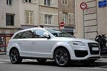 The Audi Q7 is a full-size luxury crossover SUV of the German manufacturer Audi, unveiled in September 2005 at the Frankfurt Motor Show. Production of the Q7 began in autumn of 2005 at the Volkswagen Bratislava Plant in Bratislava, Slovakia.[2] It is the first SUV offering from Audi and went on sale in 2006. Later, Audi's second SUV, the Q5, was unveiled as a 2009 model. Audi has since unveiled a third SUV model, the Q3, which went on sale in the 3rd quarter of 2011. The Q7 shares its platform and chassis with the Volkswagen Touareg and the Porsche Cayenne.