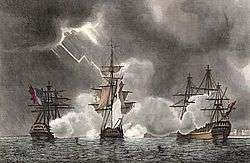 On 9 October after spending the night with the convoy in Algoa Bay, Jupiter discovered Preneuse at 34°41′S 27°54′E / 34.683°S 27.900°E and gave chase. The sea was turbulent due to a strong gale from the northwest and the chase continued into the evening before Captain William Granger was able to fire ranging shot at the French ship.[10] Lhermitte responded with his sternchasers. Granger rapidly gained on the damaged Preneuse but the state of the sea made it impossible for him to safely open his lower deck gunports and a long-range duel continued at high speed throughout the night and much of the following two days.[11] At 14:00 on 10 October Granger was finally close enough to bring Lhermitte to action, but found that with his 24-pounder guns unusable he was restricted to his upper deck 12-pounder guns, which were no match for Lhermitte's main battery. As a result, the rigging on Jupiter was rapidly shot away and the British ship fell back for urgent repairs and Preneuse was able to take the opportunity to escape. Granger returned to Table Bay on 16 October.[10]