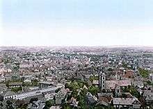Between 1904 and 1930, Bielefeld grew, opening a rebuilt railway station, a municipal theatre, and finally, the Rudolf-Oetker-Halle concert hall, renowned for its excellent acoustics.[2] The Dürkopp car was produced 1898-1927. After printing emergency money (German: Notgeld) in 1923 during the inflation in the Weimar Republic, Bielefeld was one of several towns that printed very attractive and highly collectable banknotes with designs on silk, linen and velvet. These pieces were issued by the Bielefeld Stadtsparkasse (town's savings bank) and were sent all around the world in the early 1920s. These pieces are known as Stoffgeld – that is, money made from fabric.[3]