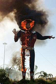 On October 19, 2012, the last weekend of the 2012 State Fair of Texas, Big Tex was destroyed by an electrical fire that started in the right boot and worked its way up the structure, first becoming visible from the neck area. After the fire, a new Big Tex was created by SRO Associates and Texas Scenic Co. This rendition made its first public appearance on September 26, 2013.[1][2]