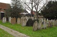Worshippers from across northern Sussex came to this chapel; many were from the village of Billingshurst a few miles away.[4][6] This group later became large enough to split from the Horsham congregation and establish a chapel in their home village. They chose a grassy, raised site set back from the west side of the High Street,[7] and erected a modest cottage-like chapel in 1754.[note 1][7][8][9] The founders were William Turner and William Evershed, whose initials are recorded on a dated stone tablet inside.[10] Evershed was a General Baptist preacher at Horsham who moved to a farm in Billingshurst in 1742; together with Turner he held and preached at small meetings in Billingshurst.[6] The Evershed family had a long-lasting connection with the chapel: more than 120 Eversheds of various generations, including William himself,[11] are buried in the graveyard,[12] a "surprisingly big" area which surrounds the chapel and helps it "make a display in spite of itself" and its modest architecture.[7] After making plans for a chapel in the village in 1753,[6] Turner and Evershed bought the site for three guineas (£430 as of 2016).[12][13] The chapel was registered for worship in October 1754;[6] its date of founding makes it one of the oldest Nonconformist places of worship in both the Horsham district and the whole of southeast England.[8][12]