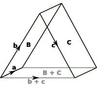 This can be interpreted geometrically as seen in the diagram: the two areas sum to give a third, with the three areas forming faces of a prism with a, b, c and b + c as edges. This corresponds to the two ways of calculating the area using the distributivity of the exterior product: