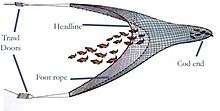 The design requirements of a bottom trawl are relatively simple, a mechanism for keeping the mouth of the net open in horizontal and vertical dimensions, a "body" of net which guides fish inwards, and a "cod-end" of a suitable mesh size, where the fish are collected. The size and design of net used is determined by the species being targeted, the engine power and design of the fishing vessel and locally enforced regulations.