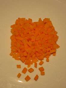 Brunoise is a culinary knife cut in which the food item is first julienned and then turned a quarter turn and diced again, producing cubes of about 3 mm or less on each side, or 1/8-inch dice. In France, a "brunoise" cut is smaller, 1 to 2 mm on each side, or 1/16-inch dice. Some typical vegetables for a brunoise are carrots, celery, leeks, and turnips. The diced vegetables are blanched briefly in salty boiling water and then submerged in salted ice water for a few seconds to set the color. The brunoise is used as a garnish in many dishes; it is often used to garnish consommé. A brunoise should be consistent in size and shape, as this helps to create a pleasing and professional presentation.[1]