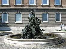 The spectacular fountain decorates the western forecourt of the palace. It shows a group of hunters led by King Matthias Corvinus together with hounds, a killed deer, Galeotto Marzio with a hawk, and Szép Ilonka with a doe. This group of people stands between fallen rocks with water running down into a basin. The fountain was made by sculptor Alajos Stróbl. The dead deer was modelled upon a majestic stag killed in 1896 by poachers in the forest owned by Stróbl. The damaged sculpture was restored after the war. Nowadays it is probably the most photographed object in the palace.