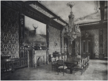 The small dining room (Ebédlő) was situated in the northern part of the Krisztinaváros wing, among the other rooms of the Royal Guest Suite. Four windows opened towards Krisztinaváros. The ceiling was stuccoed, while the walls were covered with carved wooden panelling and wallpaper. A stone mantelpiece and large painting above it (depicting a hunting scene with a deer) gave a homey feeling to the room. It was furnished with a crystal chandelier and a long dining table with 12 chairs.