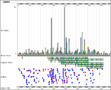 The COSMIC database contains thousands of somatic mutations that are implicated in the development of cancer. The database collects information from two major sources. Firstly, mutations in known cancer genes are collected from the literature. The list of genes that undergo manual curation are identified by their presence in the Cancer Gene Census.[9][10] Secondly, data for inclusion in the database is collected from whole genome resequencing studies of cancer samples undertaken by the Cancer Genome Project.[7] For example, Campbell and colleagues used next generation sequencing to examine samples from two individuals with lung cancer which led to the identification of 103 somatic DNA rearrangements.[11]
