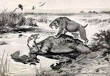 Just before the appearance of C. dirus, North America was invaded by the genus Xenocyon (ancestor of the Asian dhole and the African hunting dog) that was as large as C. dirus and more hypercarnivorous. The fossil record shows them as rare and it is assumed that they could not compete with the newly derived C. dirus.[20]:p60 Stable isotope analysis indicates that Canis dirus, the saber-toothed cat Smilodon fatalis, and the extinct American lion Panthera atrox competed for the same prey.[62][63][71] Other large carnivores present at that time include the extinct North American giant shortfaced bear Arctodus simus, the extant cougar Puma concolor, the Pleistocene coyote Canis latrans, and the gray wolf Canis lupus.[62][63] These predators may have competed with humans who hunted for similar prey.[62] Specimens that have been identified by morphology to be Beringian wolves (lupus) and radiocarbon dated between 25,800-14,300 YBP have been recently found in the Natural Trap Cave at the base of the Bighorn Mountains in Wyoming, United States. The location is directly south of what would at that time have been the division between the Laurentide Ice Sheet and the Cordilleran Ice Sheet. A temporary channel between the glaciers may have existed that allowed these large, Alaskan direct competitors of the dire wolf that were also adapted for predating on megafauna to come south of the ice sheets. Dire wolves were absent north of 42°N latitude in the Late Pleistocene, therefore this region would have been available for Beringian wolves to expand south along the glacier line. How widely they were then distributed is unknown. These also became extinct at the end of the Late Pleistocene as did the dire wolf.[23]