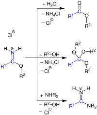 Carboximidates are good electrophiles and undergo a range of addition reactions; with aliphatic imidates generally reacting faster than aromatic imidates.[1] They can be hydrolyzed to give esters and by an analogous process react with amines (including ammonia) to form amidines. Aliphatic imidates react with an excess of alcohol under acid catalysis to form orthoesters RC(OR)3, aromatic imidates can also be converted but far less readily.