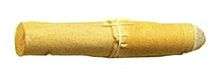 Paper cartridges have been in use for nearly as long as hand-held firearms, with a number of sources dating their use back to the late 14th century. Historians note their use by soldiers of Christian I in 1586, while the Dresden Museum has evidence dating their use to 1591, and Capo Bianco wrote in 1597 that paper cartridges had long been in use by Neapolitan soldiers. Their use became widespread by the 17th century.[3] The 1586 cartridge consisted of a charge of powder and a bullet in a paper tube. Thick paper is still known as "cartridge paper" from its use in these cartridges.[4] Another source states the cartridge appeared in 1590.[5] King Gustavus Adolphus of Sweden had his troops use cartridges in the 1600s.[6] The paper was formed a cylinder with twisted ends; the ball was at one end, and the measured powder filled the rest.[7]