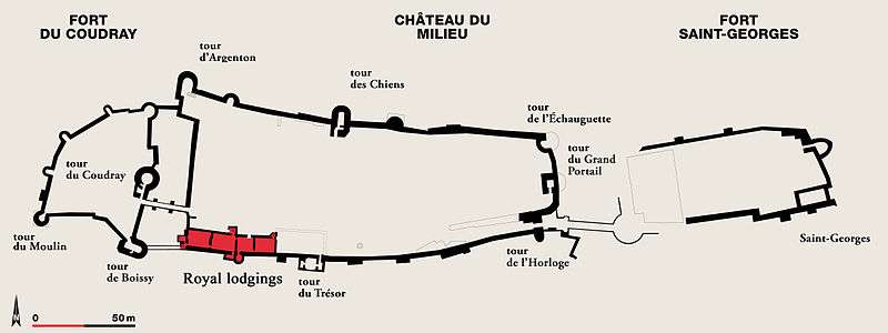 The easternmost enclosure is known as Fort St-Georges, the central is the Château du Milieu (the middle castle), while the westernmost is known as the Fort du Coudray. The Fort St-George was built under Henry II and contained a chapel dedicated England's patron saint. The Château du Coudray was added by Philip II in the early 13th century, while the Château de Milieu was built in the 12th and 14th centuries.[44] The round Tour du Coudray built by Philip II (which has parallels at Dourdan, Falaise, Gisors, Laon, and Lillebonne)[25] guarded the bridge linking the Fort du Coudray and the Château de Milieu.[45] While the curtain wall stands in many places, the buildings within the château do not survive to the same extent, and in many cases little more can be said about them than the location of their foundations and possible use.[40]