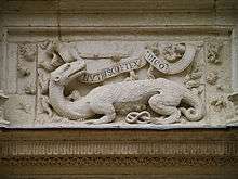 The staircase has three floors, each with a double bay window forming a mezzanine which looks out over the courtyard. The entryway, which resembles a Roman triumphal arch, is decorated with the initials of Gilles Berthelot and his wife, while the pediments overhanging each window bay are carved with the salamander and ermine of Francis I and his wife, Claude of France, in honour to the monarch of the time.[19] Inside, the ceiling of the staircase is made up of medallions sculpted with the profiles of the kings and queens of France from Louis XI to Henry IV.[20] With its columns and pilasters, and ornate carvings of shells, medallions and other symbols, this impressive staircase provides a clear example of the influence of Italian renaissance style in the château's design.