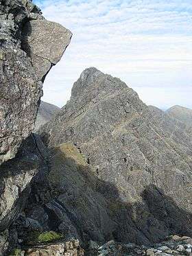 Clach Glas is a mountain on the Black Cuillin of Skye - its elevation is 786 m (2,579 ft) and the name translates as The Grey Stone. It is often traversed as a sustained scrambling route to Blà Bheinn, mostly at a standard between Easy and Moderate, depending on the line followed (see Parker, routes 101 & 102). It is the penultimate mountain in the Greater Traverse of the Black Cuillin.
