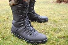 The current combat boot used by the Norwegian armed forces is the M77. It was introduced in 1977 and is produced by Alfa Skofabrikk AS.[10] The M77 boot took ten years to develop and strict requirements were set for weight, durability, water resistance, comfort, as well as ease of maintainece and good heat resistance to facilitate quicker drying.[11] The Norwegian army frequently test boots from other manufacturers, however they have not made any plans to change boots for their soldiers.[11] The M77 boot has notches along the sole and in the heel made for the NATO issue skis used by the Norwegian Armed Forces. The bindings for these skis fit the M77 boots as well as the thick waterproof outer shoes they can be put in. The boots can be used for skis as well as snowshoes.
