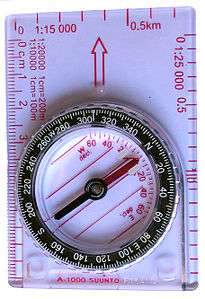 A magnetic compass points to magnetic north, not geographic north. Compasses of the style commonly used for hiking usually include a "baseplate" marked with a bezel that includes a graduated scale of degrees along with the four cardinal directions. Most advanced or costlier compasses include a declination adjustment. Such an adjustment moves the red "orienting arrow" (found on the base of the liquid filled cylinder that contains the needle) relative to the bezel and the baseplate. Either the cylinder has a mark to read against the scale of degrees on the baseplate, or a separate scale displays the current adjustment in degrees (i.e., the angle by which it has turned).