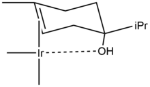 The hydrogenation of a terpen-4-ol demonstrates the ability of compounds with directing groups (the –OH group) to undergo diastereoselective hydrogenation. With palladium on carbon in ethanol the product distribution is 20:80 favoring the cis isomer (2B in Scheme 1). The polar side (with the hydroxyl group) interacts with the solvent. This is due to slight haptophilicity, an effect in which a functional group binds to the surface of a heterogeneous catalyst and directs the reaction.[11][12] In cyclohexane as solvent, the distribution changes to 53:47 because haptophilicity is no long present (there is no directing group on cyclohexane). The distribution changes completely in favor of the cis isomer 2A when Crabtree's catalyst is used in dichloromethane. This selectivity is both predictable and practically useful.[13] Carbonyl groups are also known to direct the hydrogenation by the Crabtree catalyst to be highly regioselective.[14][15][16]