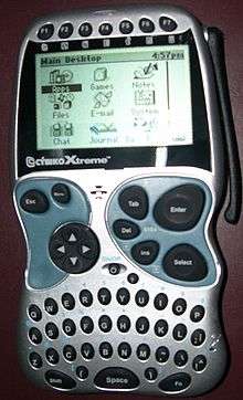 The Cybiko is a Russian handheld computer introduced in the U.S. by David Yang's company Cybiko Inc. as a retail test market in New York on April 2000,[1][2] and rolled out nationwide on May 2000.[3] It is designed for teens,[4][5] featuring its own two-way radio text messaging system.[6] It had over 430 "official" freeware games and applications.[7] Because of the text messaging system, it features a QWERTY keyboard that was used with a stylus. An MP3 player add-on was made for the unit as well as a SmartMedia card reader. The company stopped manufacturing the units after two product versions and only a few years on the market. Cybikos can communicate with each other up to a maximum range of 300 metres (0.19 miles). Several Cybikos can chat with each other in a wireless chatroom. By the end of 2000, the Cybiko Classic sold over 500,000 units.[8]