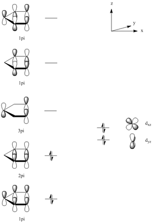 Metallabenzene complexes have been classified into three varieties; in such compounds the parent acyclic hydrocarbon ligand is viewed as the anion C5H5. The 6 π electrons in the metallacycle conform to the Hückel (4n+2) theory.[13]