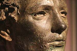 The famous "Venus of Cyrene", a headless marble statue representing the goddess Venus, a Roman copy of a Greek original, was discovered by Italian soldiers here in 1913. It was transported to Rome, where it remained until 2008, when it was returned to Libya.[9] A large number of Roman sculptures and inscriptions were excavated at Cyrene by Captain Robert Murdoch Smith and Commander Edwin A. Porcher during the mid nineteenth century and can now be seen in the British Museum.[10] They include the Apollo of Cyrene and a unique bronze head of an African man.[11][12]