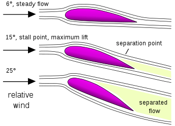 In fluid dynamics, a stall is a reduction in the lift coefficient generated by a foil as angle of attack increases.[1] This occurs when the critical angle of attack of the foil is exceeded. The critical angle of attack is typically about 15 degrees, but it may vary significantly depending on the fluid, foil, and Reynolds number.