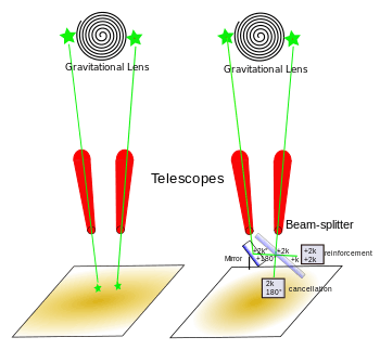 The cosmic experiment envisioned by Wheeler could be described either as analogous to the interferometer experiment or as analogous to a double-slit experiment. The important thing is that by a third kind of device, a massive stellar object acting as a gravitational lens, photons from a source can arrive by two pathways. Depending on how phase differences between wavefunction pairs are arranged, correspondingly different kinds of interference phenomena can be observed. Whether to merge the incoming wavefunctions or not, and how to merge the incoming wavefunctions can be controlled by experimenters. There are none of the phase differences introduced into the wavefunctions by the experimental apparatus as there are in the laboratory interferometer experiments, so despite there being no double-slit device near the light source, the cosmic experiment is closer to the double-slit experiment. However, Wheeler planned for the experiment to merge the incoming wavefunctions by use of a beam splitter.[17]