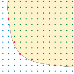 Let be a fixed number, and let be the set of pairs of numbers whose product is at least . When defined over the positive real numbers, has infinitely many minimal elements of the form , one for each positive number ; this set of points forms one of the branches of a hyperbola. The pairs on this hyperbola are minimal, because it is not possible for a different pair that belongs to to be less than or equal to in both of its coordinates. However, Dickson's lemma concerns only tuples of natural numbers, and over the natural numbers there are only finitely many minimal pairs. Every minimal pair of natural numbers has and , for if x were greater than K then (x −1,y) would also belong to S, contradicting the minimality of (x,y), and symmetrically if y were greater than K then (x,y −1) would also belong to S. Therefore, over the natural numbers, has at most minimal elements, a finite number.[3]