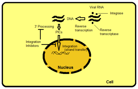 There are several ways to target integrase but strand transfer inhibition is the most intuitively obvious and readily pursued to date. Other targets include, for example, the protein domains beyond the active site of IN. The domains interact with viral or host DNA and are important for binding to the enzyme. It is possible to hamper functions of the enzyme by disrupting or removing these bindings. PIC is a multimeric protein structure inside the host cell, composed of both viral and host proteins. Integrase is a part of PIC‘s viral component. PIC‘s viral and host proteins are believed to modulate intrinsic activity of the enzyme, shuttle PIC to the nucleus and direct integration of viral DNA into a transcriptionally active region of the host genome. If it were possible to exclude certain proteins from the PIC it would block the ability of the virus to integrate into the host genome. The process where the retroviral RNA is transcribed to DNA and then integrated into the host cell's genome is shown in figure 2.[8]