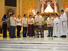 Angara (8th from left): October 4, 2012 historic Declaration of the Church of St. Dominic in Quezon City, Philippines (National Shrine of Our Lady of the Most Holy Rosary of La Naval/Santo Domingo Parish Church) as National Cultural Treasure: (L-R) - Joy Belmonte (Quezon City Vice Mayor), Cong. Vicente Crisologo (5th), Dr. Jereym Barns, CESO III, Director IV,[12] National Museum of the Philippines, (7th), Senator Edgardo Javier Angara, (8th), Rev. Fr. Giuseppe Pietro V. Arsciwals, O.P., Rector,[13] (9th) & Fr. Gerard Francisco Timoner, Prior Provincial of the Dominican Province of the Philippines[14] (10th), per Republic Act No. 10066 - National Cultural Heritage Act of 2009 - announced officially by the Catholic Bishops' Conference of the Philippines[15] and by the National Museum of the Philippines.[16]
