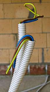 As of March 2011, the European Committee for Electrotechnical Standardization (CENELEC) requires the use of green/yellow colour cables as protective conductors, blue as neutral conductors and brown as single-phase conductors.[2] The United States National Electrical Code requires a green or green/yellow protective conductor, a white or grey neutral, and a black single phase.[3]