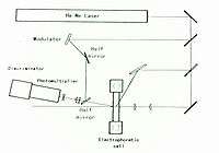 A laser beam passes through the electrophoresis cell, irradiates the particles dispersed in it, and is scattered by the particles. The scattered light is detected by a photo-multiplier after passing through two pinholes. There are two types of optical systems: heterodyne and fringe. Ware and Flygare [1] developed a heterodyne-type ELS instrument, that was the first instrument of this type. In a fringe optics ELS instrument,[2] a laser beam is divided into two beams. Those cross inside the electrophresis cell at a fixed angle to produce a fringe pattern. The scattered light from the particles, which migrates inside the fringe, is amplitude-modulated. The frequency shifts from both types of optics obey the same equations. The observed spectra resemble each other. Oka et al. developed an ELS instrument of heterodyne-type optics[3] that is now available commercially. Its optics is shown in Fig. 3.