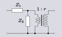 Darlington gives an equivalent transform that can eliminate an ideal transformer altogether. This technique requires that the transformer is next to (or capable of being moved next to) an "L" network of same-kind impedances. The transform in all variants results in the "L" network facing the opposite way, that is, topologically mirrored.[2]