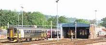 When British Railways introduced new shed codes in 1950, Exeter-based locomotives carried an oval cast plate with the code '83C'. The last locomotives based here were sent elsewhere from 14 October 1963, but the shed area was kept as a fueling and stabling point for locomotives and diesel multiple units (DMUs) working in the area.[2] From 29 December 1976 it was recognised as a depot again, even though no locomotives were allocated there at the time, and given a new code 'EX'.[2] The shed was used for many years without a roof, but in 1980 a new covered maintenance area was built.[3] New facilities were provided at the depot in 2011, including a new fueling point, and also jacks so that DMUs do not have to be sent empty to Bristol when they require lifting.[4]