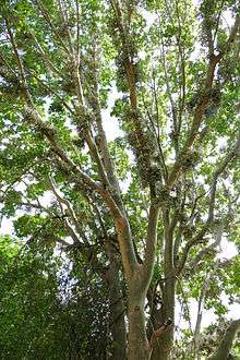 The term sycamore spelled with an A has also been used for unrelated trees: the Great Maple, Acer pseudoplatanus, or plane trees, Platanus. The spelling "sycomore", with an O rather than an A as the second vowel is, if used, specific to Ficus sycomorus .[1][2]
