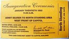 The inaugural ceremonies and luncheon for Clinton’s inauguration were planned and executed by the Joint Congressional Committee on Inaugural Ceremonies, as all inaugurations since 1901 have been. Senator Wendell H. Ford chaired the committee for Clinton’s first inauguration.[12] It is estimated that the committee spent $33 million on the inauguration.[13]