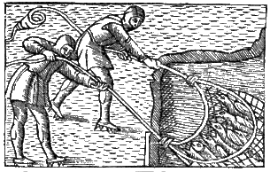 The fishers set up very light nets of buoyant flax and wheel in a circle round about while they violently strike the surface of the sea with their oars and make a din with sweeping blow of poles. At the flashing of the swift oars and the noise the fish bound in terror and rush into the bosom of the net which stands at rest, thinking it to be a shelter: foolish fishes which, frightened by a noise, enter the gates of doom. Then the fishers on either side hasten with the ropes to draw the net ashore.