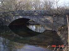 The closed-spandrel stone arch bridge has a single span of 54 feet (16 m) and is 27.7 feet (8.4 m) wide.[1] It is currently open to traffic.