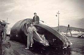 The carcass was brought to the stern of the factory ship, where several other carcasses could be waiting to be processed.[9] A line was looped around the small of its tail and it was brought to the bottom of the slipway, where the small of its flukes was secured by a whale claw (a giant pair of tongs invented by the Norwegian Anton Gjelstad in 1931[10]) and pulled up unto the deck of the ship by powerful steam winches. On each side of the whale there were large chocks built into the deck so the carcass wouldn't roll in a rough sea. Two flensers, one on each side, cut longitudinal slits along the length of the body, while another man with spiked boots climbed atop the whale to make further cuts. With the use of a winch on an arch at the center of the ship two strips of blubber were pulled off (like the peeling of a banana), which was attended by "a crackling like a bonfire of peasticks."